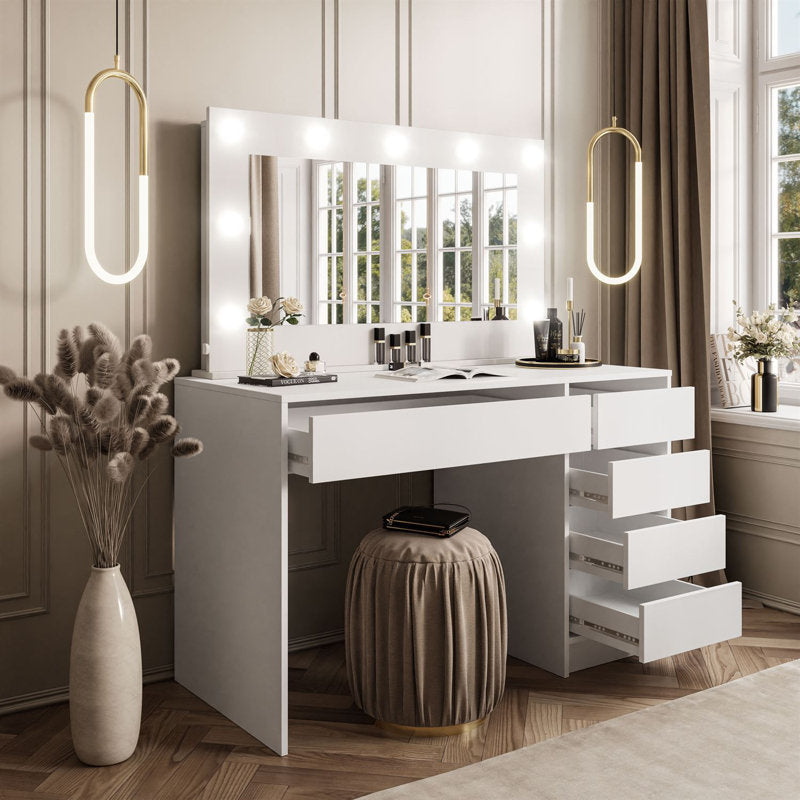 اللون : أبيض مع 4 ادراج جانبي و درج كبير من النصف ( المرايا بالدوايات و بدون لمبات )